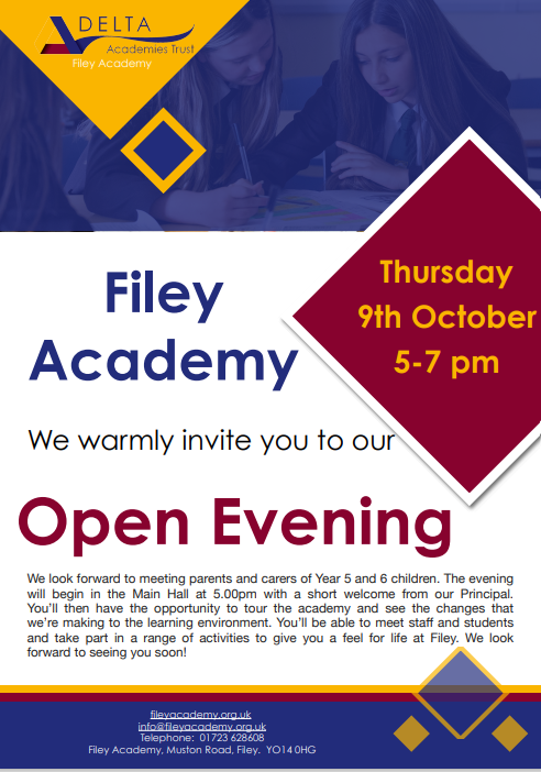 We are delighted to welcome year 5/6 students and families to our Open Evening event on 9th October. Please come and join us to meet our current students, staff and have a look around the academy. There will be lots for you to see, engage with and feel free to ask us lots of questions. We are confident you will want to join us in September 2026!