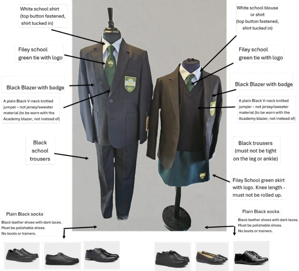 - Girls may wear a Filey School green skirt with school logo or black trousers as described above